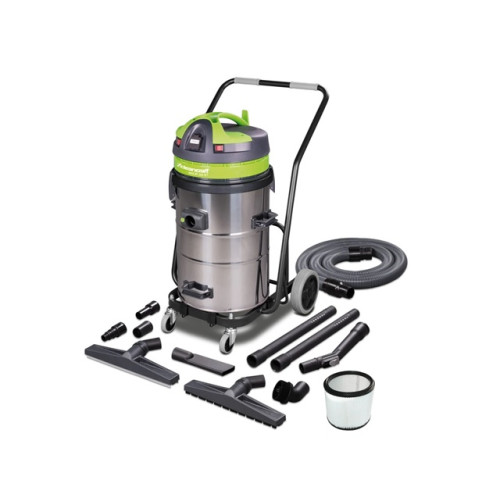 Trojmotorový vysávač určený pre vysávanie kvapalín, triesok a ďalších pevných častíc s nerezovou nádobou a naklápacím mechanizmomVstavaná zásuvka pre pripojenie elektrického náradia bez automatického spustenia pri zapnutí náradia